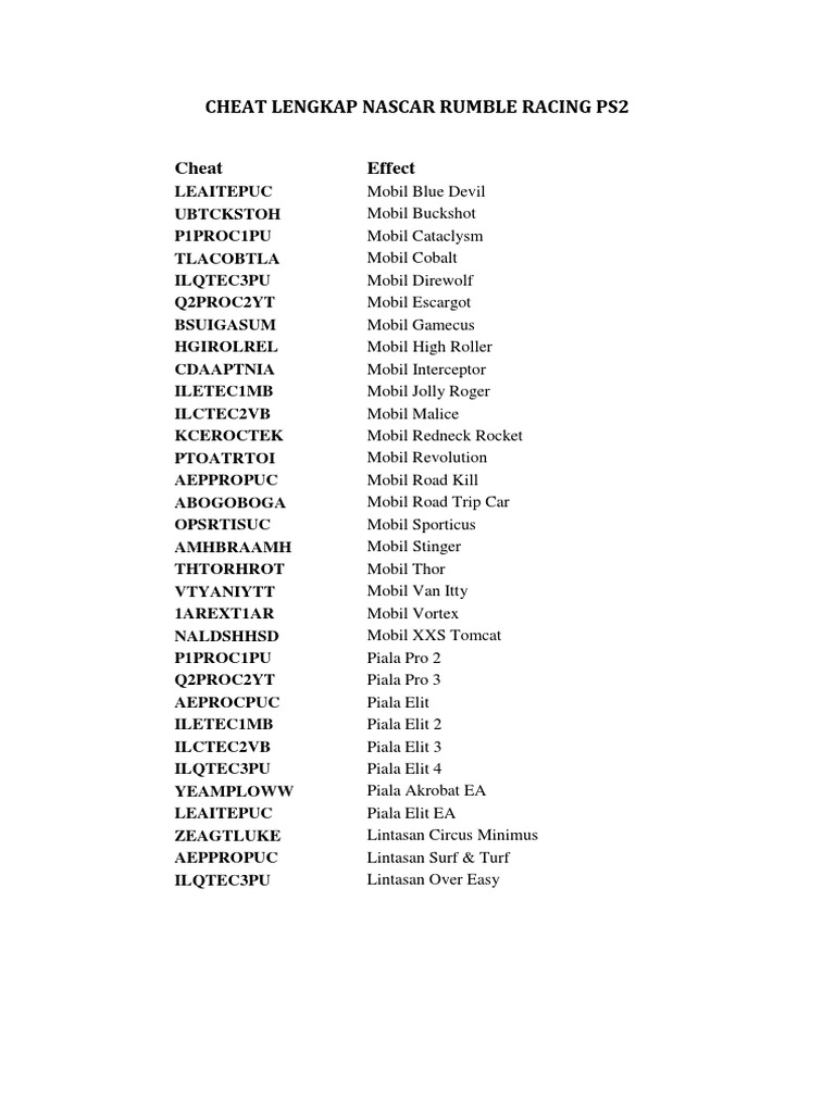 Ps2 rumble racing ps2 ford racing 2 ps2 harley davidson race to the rally ps2 alfa romeo racing italiano ps2 gallop racer 2001 ps2 juiced 2 hot import nights ps2 speed kings ps2 nascar 2005 ps2 d1 professional drift grand prix series ps2 monster 4x4 masters of metal ps2. Nascar rumble is a racing video game created by electronic arts for the playstation. To activate any of the cheats on this list, go to the options > load/save > passwords, then type in a code. Game ini menawarkan beberapa track yang mengharuskan para mekanik melakukan setting kendaraan terbaik agar bisa. Rumble racing para ps2 ficha tcnica. Jaka punya nih daftar cheat nascar rumble racing ps2 dan ps1 yang bahasa indonesia paling lengkap. Rumble racing atau lebih dikenal dengan nascar rumble,game bergenre racing ini memang asyik untuk dimainkan,dengan banyak pilihan mobil. Buat kalian yang masih main dua game legendaris ini, jaka bakalan bagiin kumpulan cheats nascar rumble racing ps2 dan ps1 supaya pengalaman bermain kalian jadi lebih.